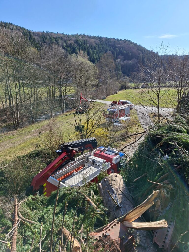 Am Samstag, dem 28.03.2026 wurden wir um 07:14 Uhr mit stillem Alarm zu einem Sturmeinsatz in den Ortsteil Riegersberg gerufen. Zwei große Bäume waren aufgrund des heftigen Sturmes umgestürzt und auf das Dach eines Einfamilienhauses gefallen.