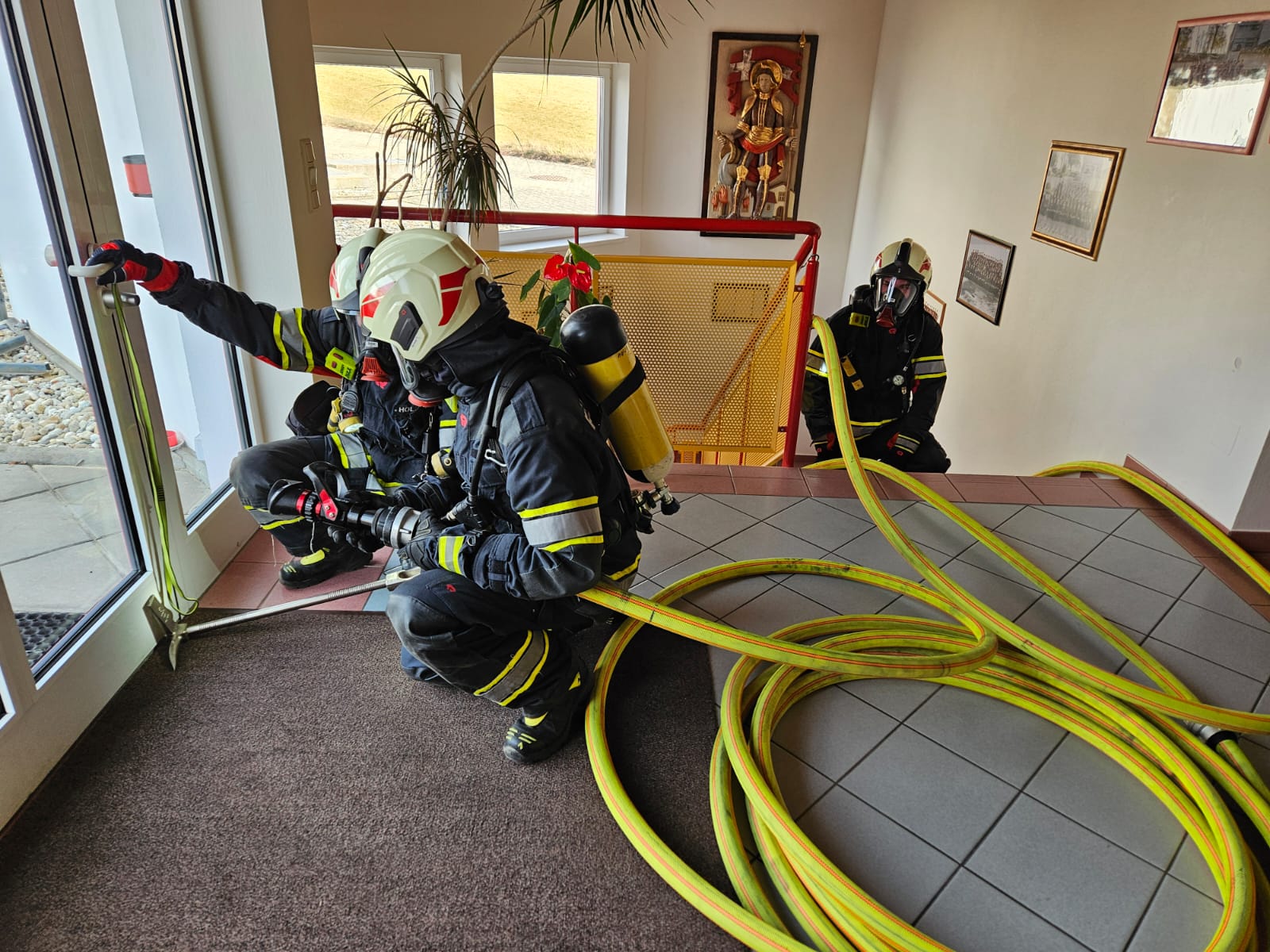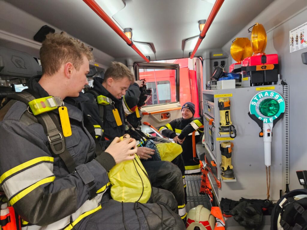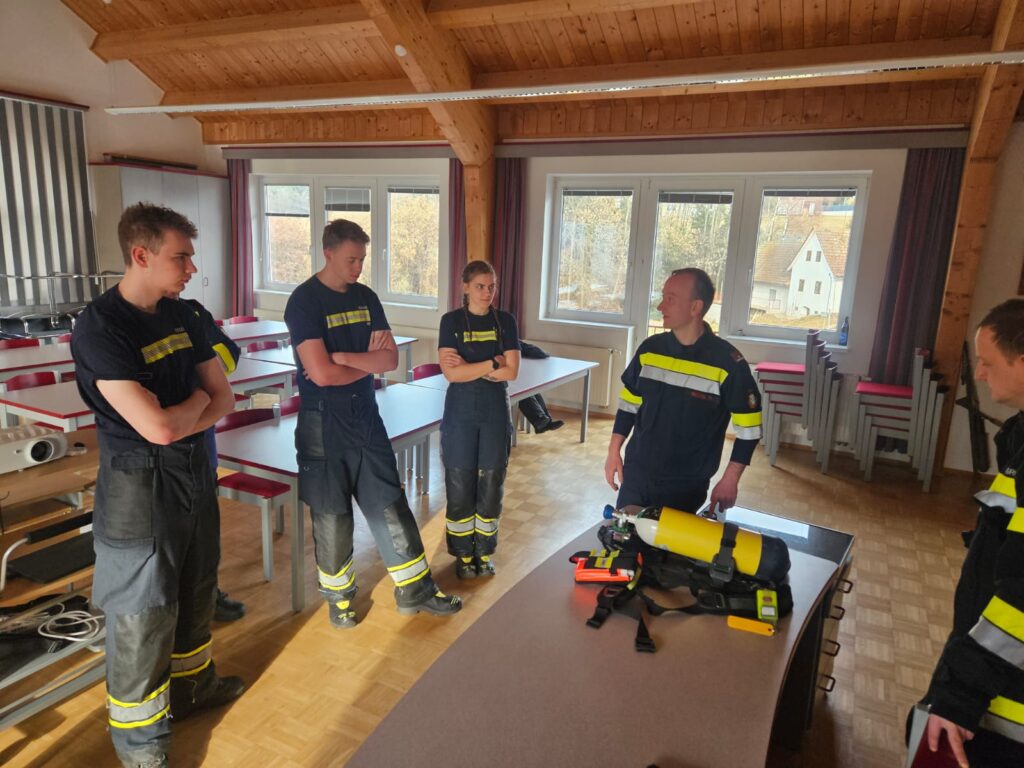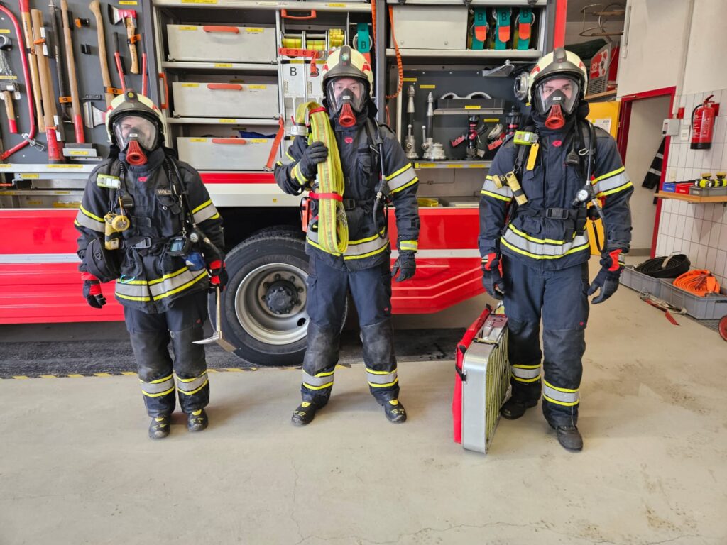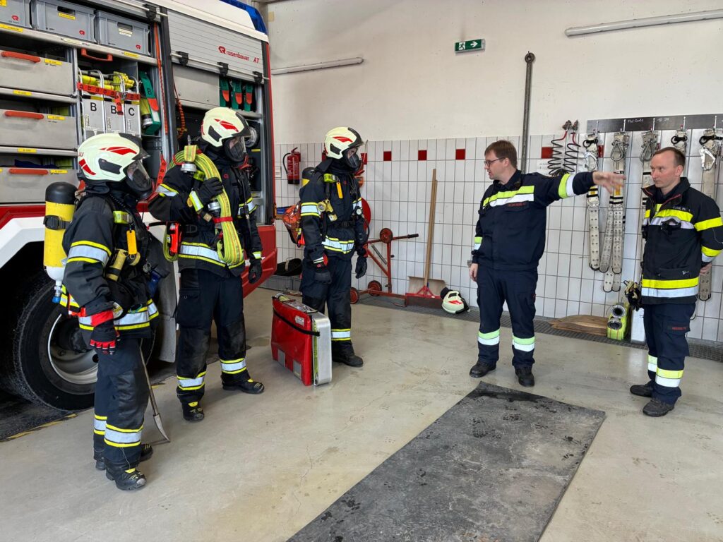 Ein wesentlicher Schwerpunkt lag auf dem strukturierten Ausrüsten des Atemschutztrupps und der klaren Aufgabenverteilung innerhalb des Trupps (Truppführer, Truppmann Nr. 1 und Nr. 2). Besonderes Augenmerk wurde dabei auf die Rolle des Truppführers als Bindeglied zum Gruppenkommandanten gelegt. Die laufende Kommunikation nach außen, das Rückmelden von relevanten Lageinformationen sowie die interne Koordination im Trupp wurden gezielt trainiert, da sie für einen sicheren und erfolgreichen Innenangriff entscheidend sind.