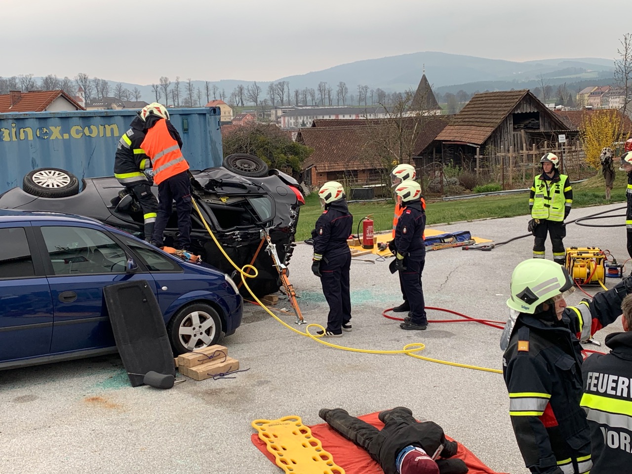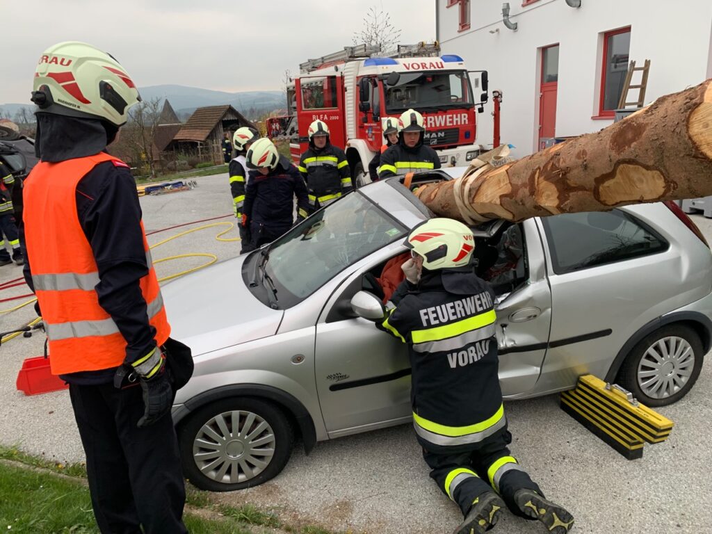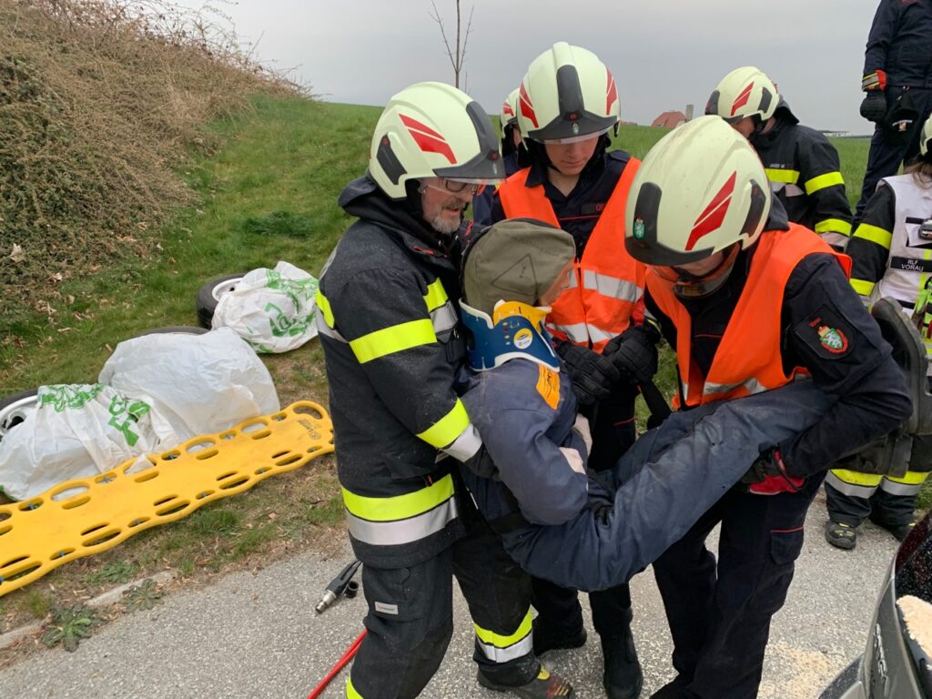 Hier musste eine verletzte Person mittels hydraulischem Rettungsgerät aus einem auf der Seite liegenden und schwer zugänglichen PKW gerettet werden. Der Zugang zum Verletzten erfolgte hier über die Heckklappe. Die Person wurde schließlich per Spineboard gerettet.