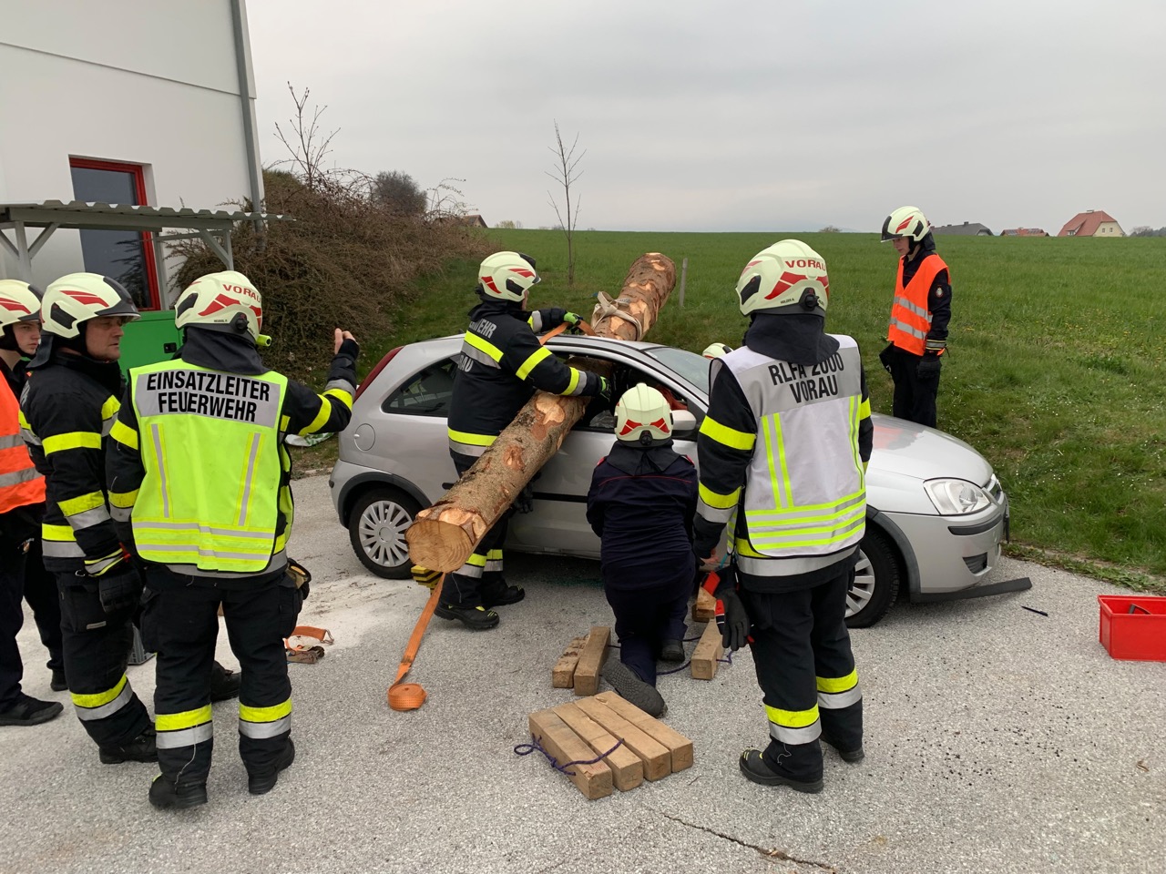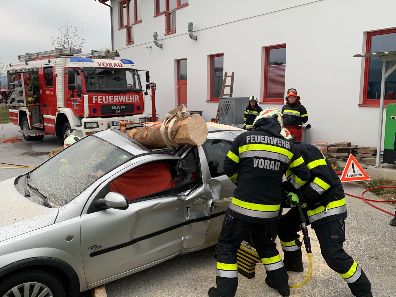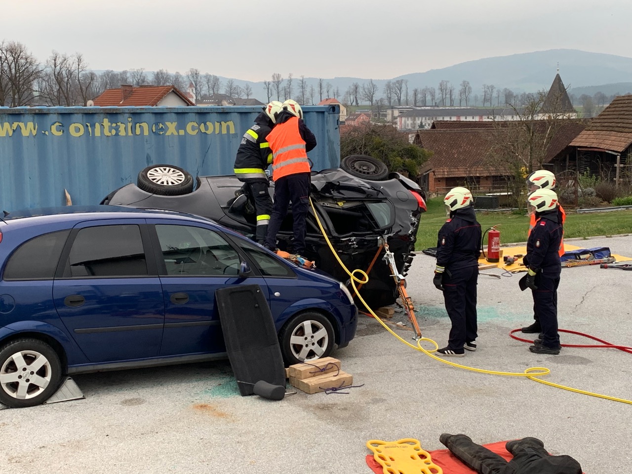 Hier musste eine verletzte Person mittels hydraulischem Rettungsgerät aus einem auf der Seite liegenden und schwer zugänglichen PKW gerettet werden. Der Zugang zum Verletzten erfolgte hier über die Heckklappe. Die Person wurde schließlich per Spineboard gerettet.