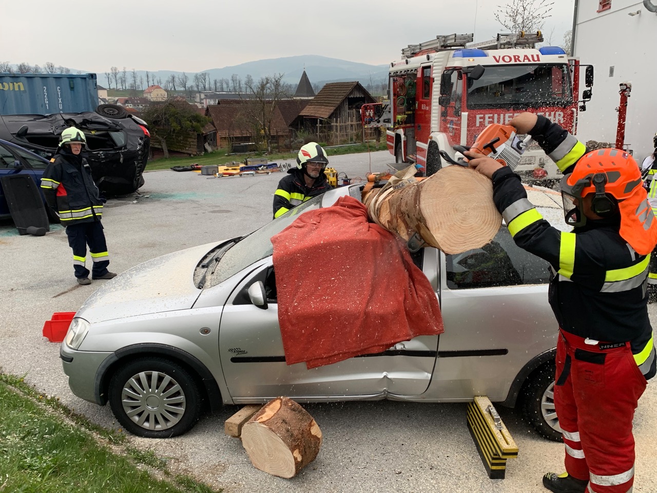 Bei der zweiten Lage hatte ein Baum das Dach bzw. Fenster eines Unfallwagen durchschlagen und stecke noch im Fahrzeug, hinter der auf dem Fahrersitz befindlichen Person fest. Hier wurde zuerst der Baum gesichert und stückweise mittels Kettensäge abgetragen. Im Anschluss wurde der Verletzte über die Fahrertüre gerettet.