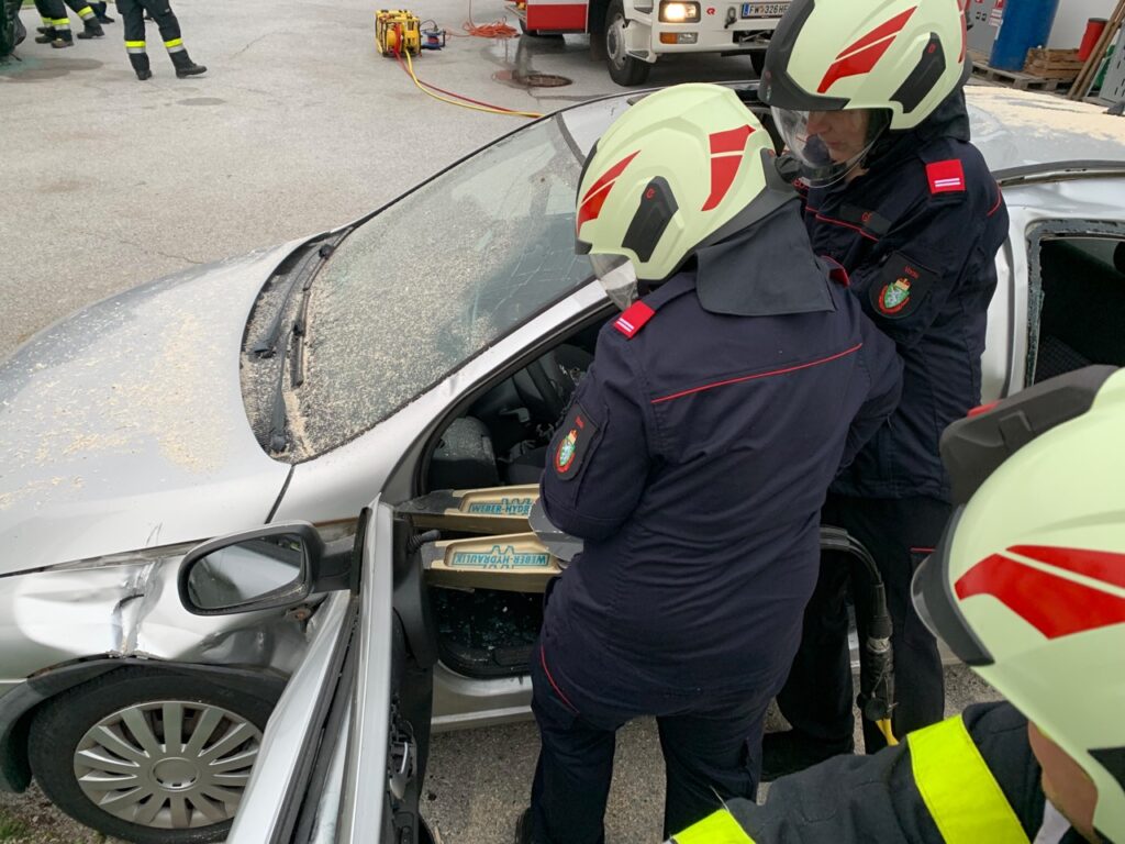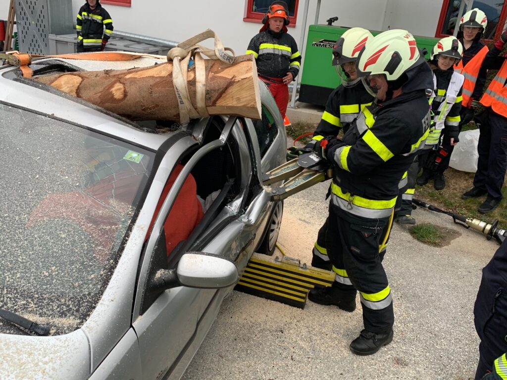 Auch die älteren Mitglieder unserer Feuerwehrjugend durften im Anschluss ihre Kräfte beim Umgang mit hydraulischem Spreitzer und Schere erproben.