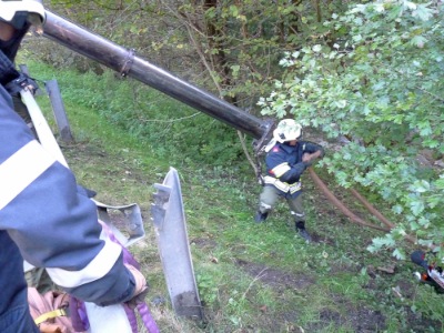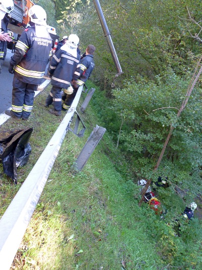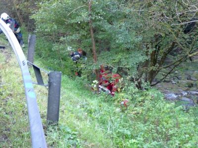 Ein Motorradfahrer war in Fahrtrichtung Rohrbach in der Kurve vor der Kläranlage zu Sturz gekommen. Fahrer und Motorrad hatten zwei Stützen der Leitschiene durchschlagen und waren auf der Böschung zum Bachbett liegen geblieben.
